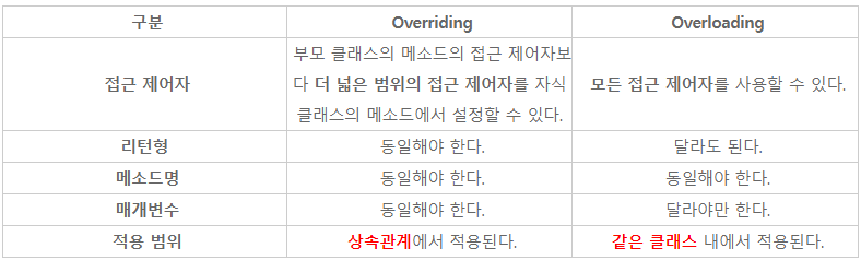 - 자식 클래스에서는 오버라이딩하고자 하는 메소드의 이름, 매개변수, 리턴 값이 모두 같아야 한다