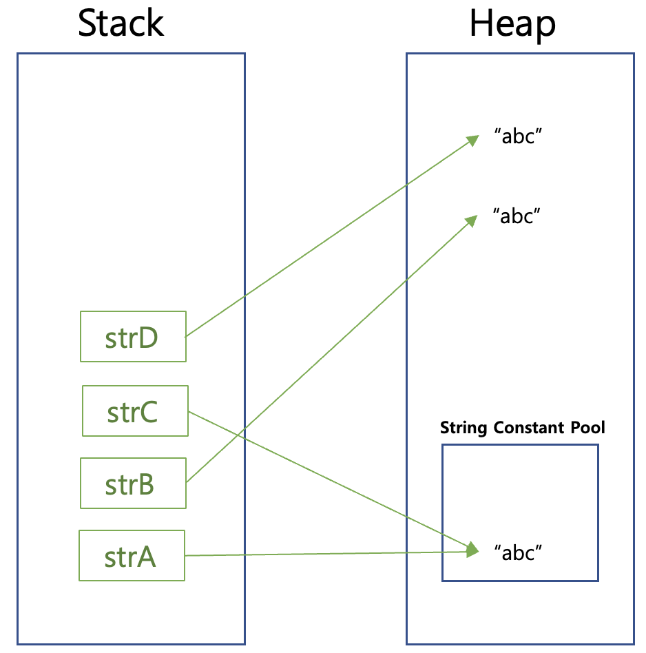 - String constant pool에 존재하는 리터럴 값 사용하면, 해당 참조값 그대로 사용