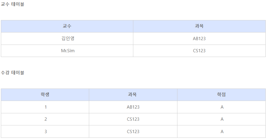 - 예를 들어 Mr.Sim이 강의하는 과목명이 바뀌었다면 두 개의 로우를 갱신해야합니다.