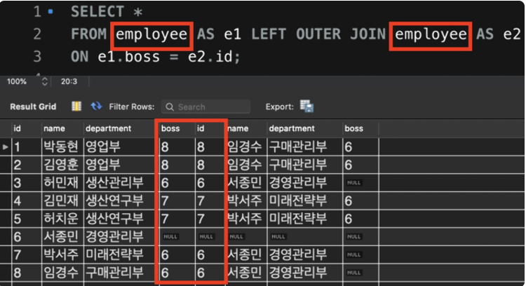 - employee 테이블의 boss 컬럼과 id 컬럼을 기준으로 LEFT OUTER JOIN인 SELF JOIN을 했더니 각 직원 옆에 직속 상사 정보도 함께 뜸!