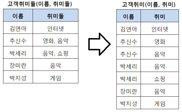 - 테이블의 컬럼이 원자값(Atomic Value, 하나의 값)을 갖도록 테이블을 분해하는 것