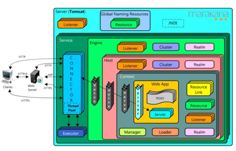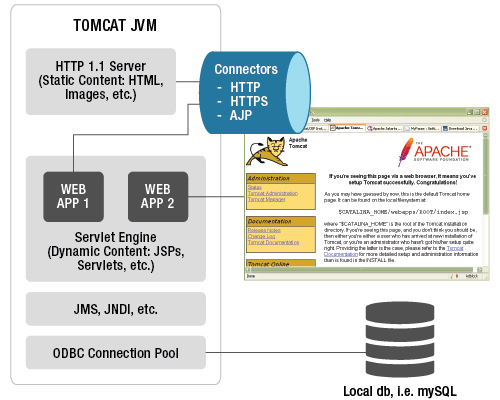 기능: Java 서블릿을 실행하여 웹 페이지에 동적 콘텐츠를 제공합니다. 사용자의 요청에 따라 서블릿을 로딩하고 실행하며, 결과를 웹 페이지로 반환합니다.